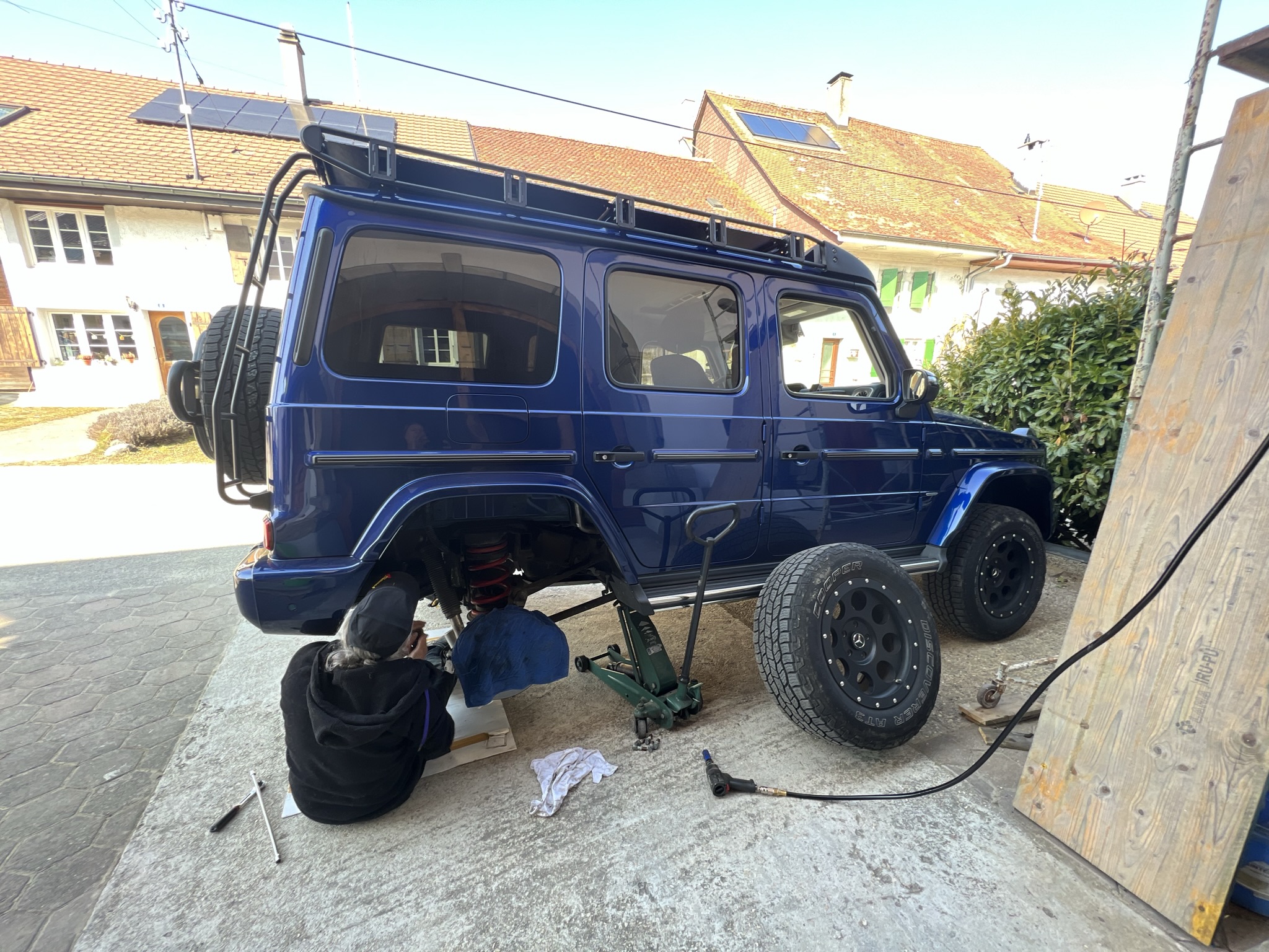 We therefore added a transparent plastic film all around, this is called a "covering". The G wagon keeps the same color, and when we get home that film can be removed and the car is back to its original delivery condition.