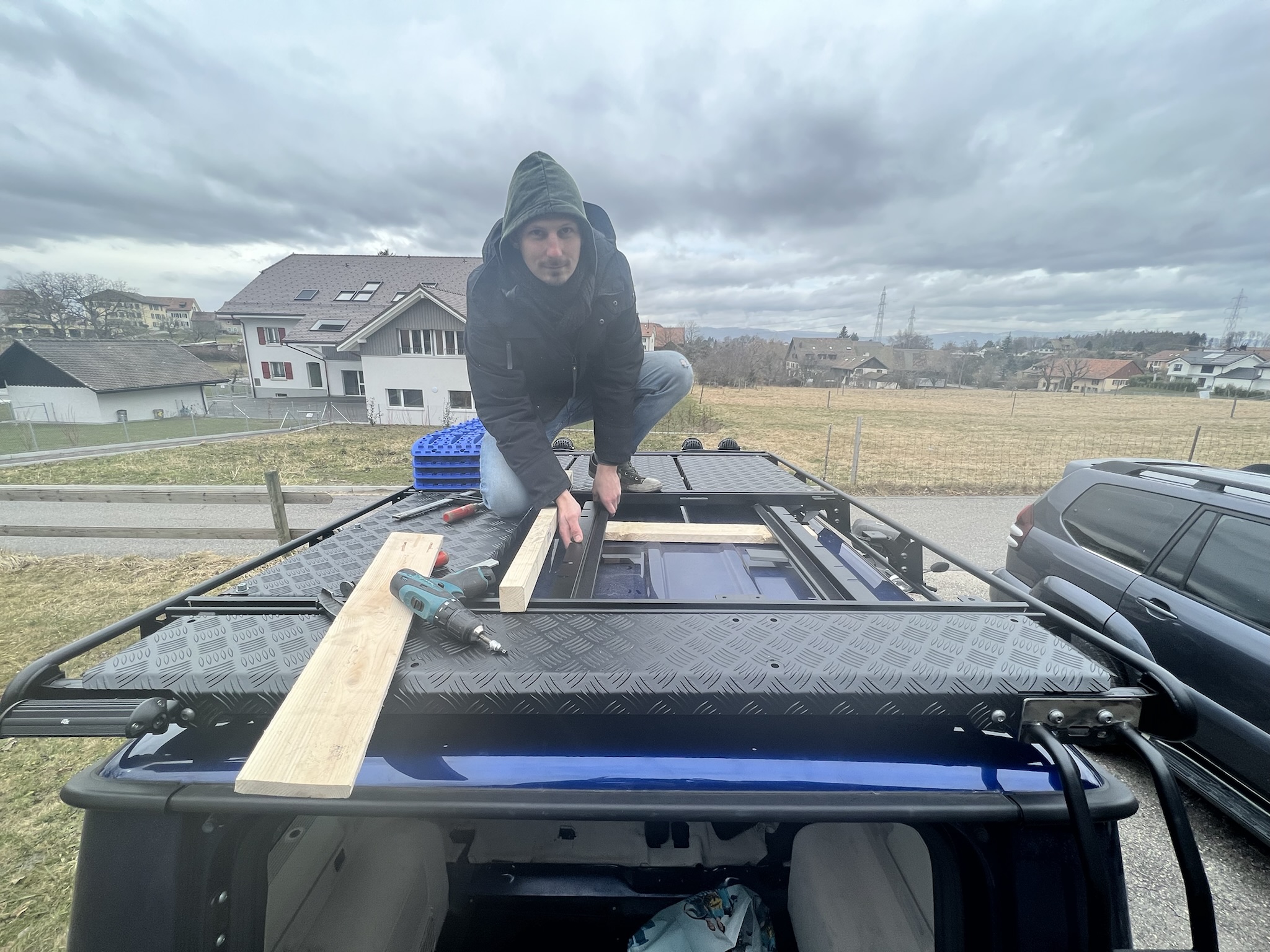 Mounting a roof rack, with wind deflector and ladder. We had to lift in the rear with 3cm rubbers, to adapt a FrontRunner camping table between the roof and roof rack.