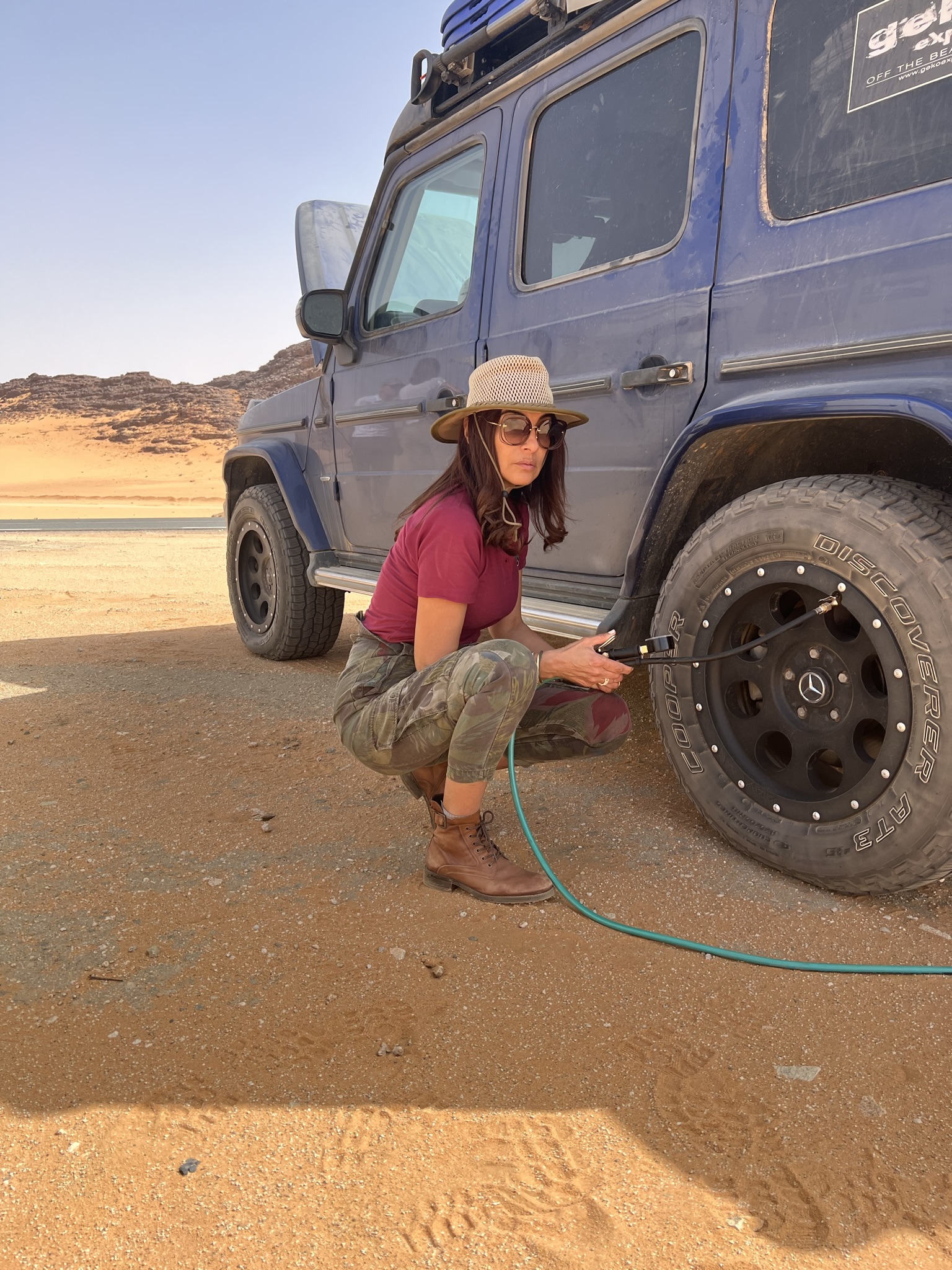 It is impossible, when deflating the tires, to drive on sand or rocks with narrow sidewalls. We (finally) put on 285/65 R18 BFGoodrich all-terrain tires.